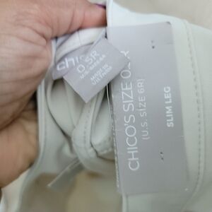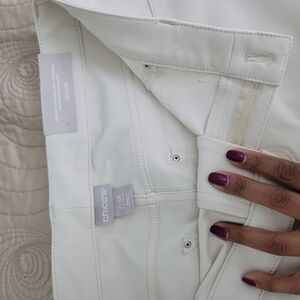 These cream straight leg pants from Chico's offer a tailored fit with a minimalist aesthetic. Crafted from a structured fabric, they provide a clean and streamlined silhouette perfect for versatile styling. The light, neutral color enhances their adaptability for various occasions.