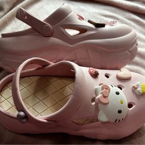 Only worn once! Step into a world of fun with these Hello Kitty pink sandals, designed for comfort and style. Featuring a delightful Hello Kitty motif and a soft pink hue, these sandals are perfect for fans of the iconic character. The slip-on design with a flexible heel strap ensures a snug fit, making them ideal for casual outings.