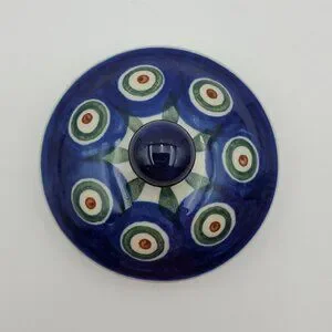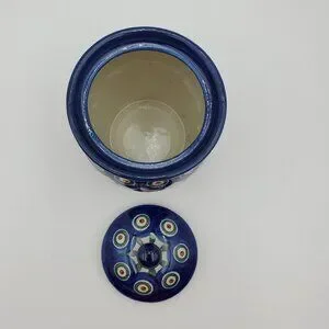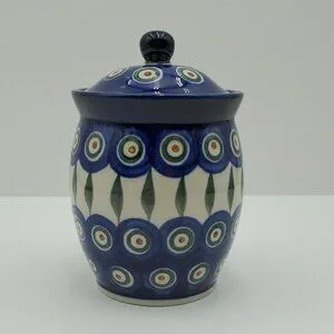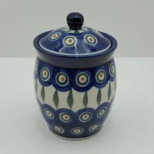 Polish Pottery Peacock Leaves Jar with Lid Peacock Sugar Bowl Small Lidded Jar
