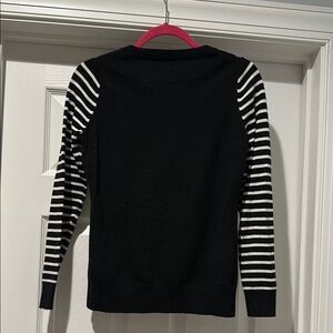 This Banana Republic sweater features a striking black and white design with a prominent bow motif on the front. The crew neck style is enhanced by ribbed cuffs and classic horizontal striped sleeves, creating a chic and timeless look.30% wool