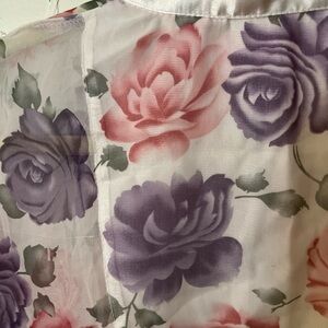 Pretty floral, sheer robe or kimono from Contessa di Roma. Polyester, with satin like trim. Has the inside ties but the outside tie is missing. I was going to wear it with jeans and a white tee but it’s way too long for me. No pockets. Would be super cute over a swim suit. Measurements in the photos. From a smoke free, pet friendly home.