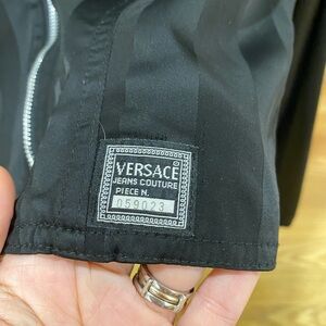 VGUC. Made in Italy, black on black Versace long sleeve zip up jacket//top with Medusa head medallions. No fabric tag it’s a mix between satin & windbreaker, I took close up photos so you can see the fabric. Silver Zipper works perfect. Slightly cropped. Cute!