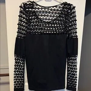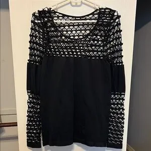Brand new, never worn . This elegant black blouse from VENUS showcases a chic cut-out design, complemented by textured sleeves that add a touch of sophistication. The smooth fabric of the body contrasts beautifully with the intricate sleeve detailing, making it a versatile and stylish addition to any wardrobe.