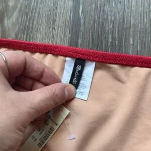 Dive into style with the Madewell bikini bottom, featuring a vibrant red exterior and a contrasting tan lining. Crafted from a smooth, stretchy nylon/spandex blend, this classic swimwear piece offers comfortable coverage and a sleek fit. Perfect for sun-soaked days by the water.