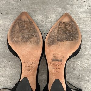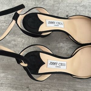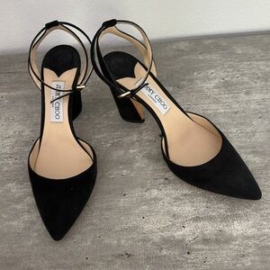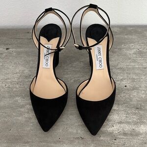 These elegant Jimmy Choo heels boast a sleek black design with a pointed toe and a unique ankle strap. Crafted from premium materials, they offer a timeless silhouette perfect for formal occasions. This shoes are in excellent condition. They run small. Fit true US size 8 1/2
