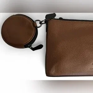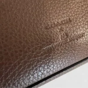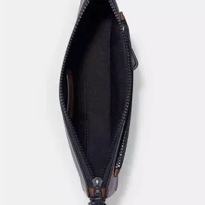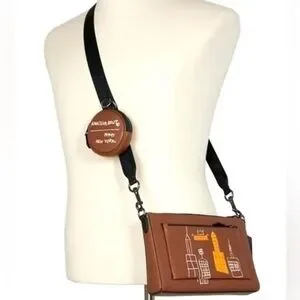 This Coach crossbody bag features a rich brown leather exterior adorned with vibrant orange cityscape artwork, offering a unique urban flair. Its sleek, elongated shape and artistic motif make it a standout accessory for any occasion. Crafted for both style and functionality, this bag is perfect for those who appreciate a blend of fashion and practicality.