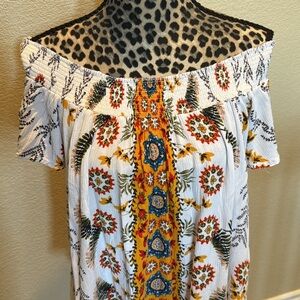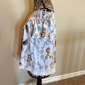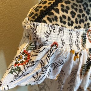 This relaxed blouse features a ruffled neckline and flutter sleeves, adorned with a striking white and orange pattern. Perfect for a casual day out, its bohemian-inspired design adds a touch of elegance to any outfit. Fringe detail