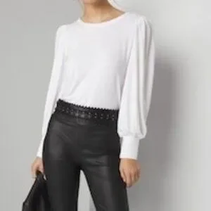 WHBM White Tee Featuring a Feminine Jewel Neckline with Bishop Sleeves and Smocked Cuffs Adding Elegance and Sophistication to Any Outfit