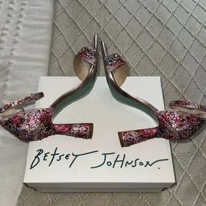 These Betsey Johnson heels feature a dazzling pink sequin design with a chunky block heel and an elegant ankle strap. Perfect for making a statement at special occasions, these shoes add a touch of glamour to any outfit.