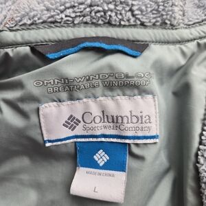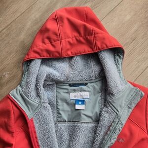 Columbia shell face 92% polyester / 8% elastane, shell back 100% polyester vibrant blood orange omni-windblock breathable windproof softshell hooded jacket with gray fleece lining. Omni-Wind™ Block repels wind and rain using a breathable yet durable barrier, so you stay dry and comfortable and protected in damp and/or gusty windy weather. Front slant pockets with fleece lining and zipper for security. Hood with bungee cord with cinched fit. Arm holes with hook and loop to cinch closed to adjust fit as well as inner bungee cord to bottom hem for cinched fit. Women's LARGE full zip jacket and comes with women's MEDIUM matching gloves. VGUC **light signs of wear to fleece lining.