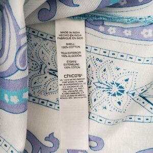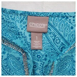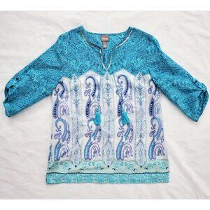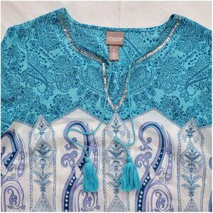 Chicos Lightweight Turquoise 3/4 Sleeve Boho Print Tunic Top Tassels Size M