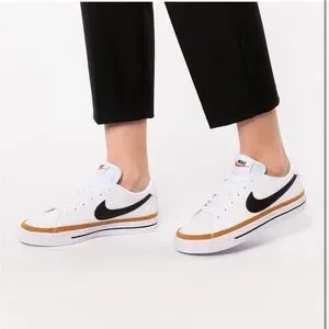 Nike sneakers featuring a white base, black swoosh, and gold trim. Ideal for everyday style.