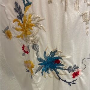Elegant white long sleeve top featuring colorful embroidery. Perfect for adding a touch of style to any outfit.