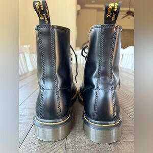 Like NEW (No tags/no box. These boots were tried on and briefly and worn in doors. There may be light scuffing but otherwise in like new condition) Experience the iconic style of Dr. Martens with these black combat boots, featuring a smooth leather finish and signature yellow stitching. The 8-eyelet lacing system and air-cushioned sole ensure both comfort and durability, making them a timeless addition to any wardrobe.
