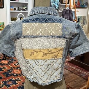This is a denim jacket with short sleeves HENGSHENG is the brand. This is a size small to medium Crop bomber style with lots of hand, sewing machine, sewing button, attached and workmanship on the back. This is from an up cycle, designer taking new and slightly distressed jackets, and giving them new life.