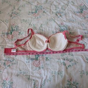 Gorgeous floral lace trim bra. Light side boning, fully adjustable straps, and 2 rows of 3 hook closure. Cups have pockets for padding, padding not included. I believe it was Step 1. Size US 34F (JPN F75) on tags, Bradelis runs small, see size chart in pics. Some loose threads, does not affect fit and function. Washed in lingerie bag on delicates cycle with cold water and air dried.