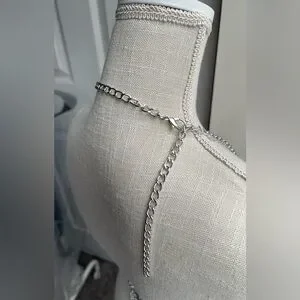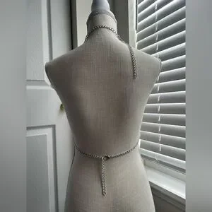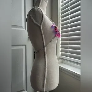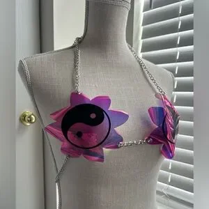 💕This harness features vinyl iridescent flowers with yin and yang signs and faux silver adjustable chains. It’s in good condition with some warping of the vinyl flowers, no stains or tarnishes.