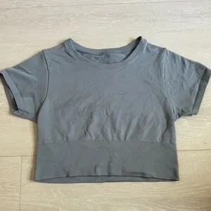 This Aerie gray crop top features a fitted design, ideal for a chic, casual style. It is crafted from a smooth, stretchy knit material for ultimate comfort and a modern, seamless look.