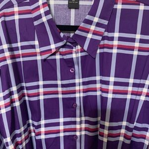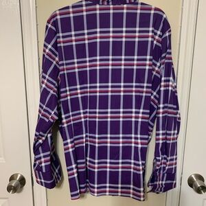 Stylish purple plaid shirt. Button-down front. Tie waist detail. Perfect for casual wear.