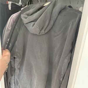 Cozy gray sweater with purple graphic. Features hood and front pocket. Perfect for casual wear.