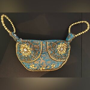 This exquisite handbag features intricate blue and gold beadwork, perfect for adding a touch of elegance to any outfit. The unique design and luxurious colors make it a standout accessory. Brand new never used