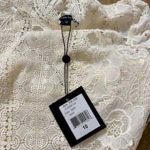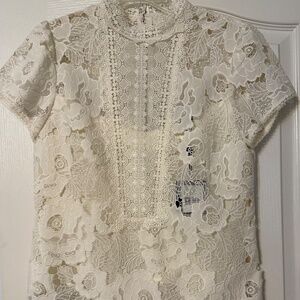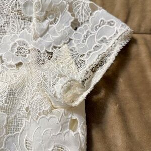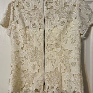 This lovely lace top comes from the original Nanette Lepore design label. It has a back zipper and two dainty buttons, in the back. This top can be dressed up or down, and would look stunning under a suit jacket! The built in lining is a matching cream color.