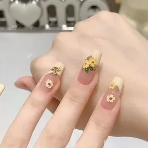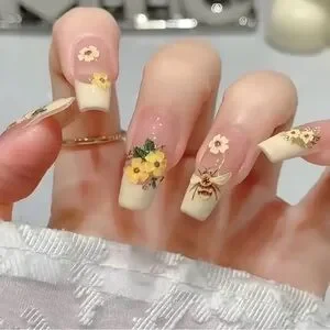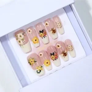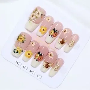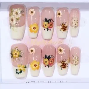 Floral Bee acrylic Nail Art 10 pc Set - Cream & Yellow Reusable French Tip NWT