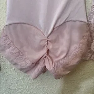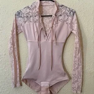 This fitted bodysuit showcases a romantic blend of pink lace and smooth fabric, featuring long sleeves and a stylish tie front. The intricate lace detailing adds a touch of elegance, making it a versatile piece for any wardrobe.