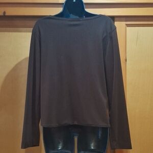 This dark brown top is comfy and easy care. Machine wash, hang to dry. It measures 23" from shoulder to hem and 20.5" pit to pit. Looks great with skirts or pants.