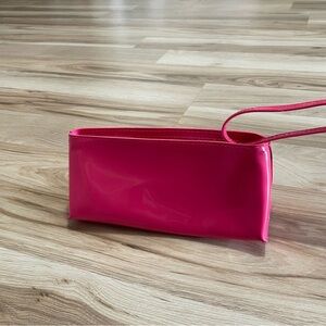 Sleek pink cosmetic bag by Clinique. Features a convenient wrist strap. Perfect for organizing essentials.
