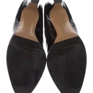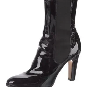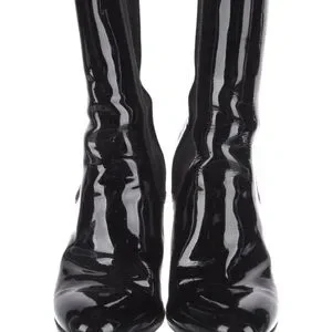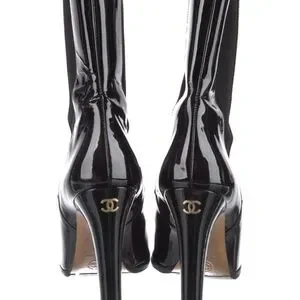 These elegant black heeled boots from Chanel feature a high stiletto heel and a glossy patent leather finish. The mid leg high silhouette is complemented by the iconic Chanel CC logo on the heel, offering a touch of sophistication and luxury.