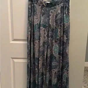 Elegant paisley print palazzo pants in shades of gray and teal. Perfect for a stylish and comfortable look; and a bonus is that they have pockets.