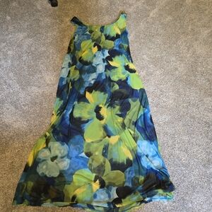 Vibrant floral maxi dress. Features blue and green hues. Sleeveless design. Perfect for summer outings.