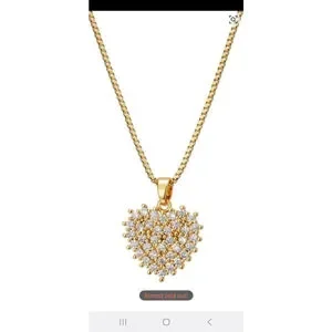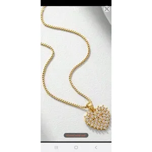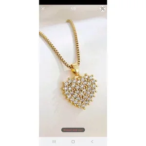 This is a new, boxed heart pendant necklace. The pendant is heart-shaped and covered in clear stones. The chain is a gold-toned box chain. The necklace is new with tags and comes in its original box. There are no visible imperfections.