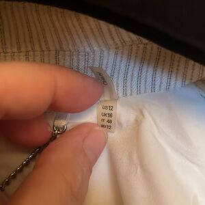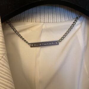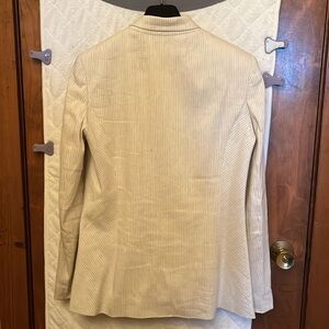 Elie Tahari cream striped linen jacket (70% linen and 30% polyester so doesn’t wrinkle as much as pure linen and keeps its shape). One button closure in front. Length is approximately 28” from shoulder to hem. Beautiful detail in stripe pattern. Great for summer! Looks great with jeans, over a dress — for work or summer party. Very good condition.