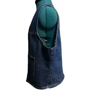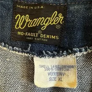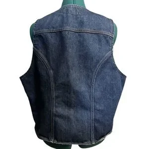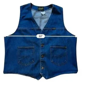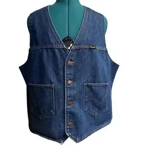 This product is a vintage Wrangler denim vest from the 1980s, made in the USA. It is in a classic blue color and features a cowboy western look, perfect for casual occasions. The vest is sized XL and is an original piece, adding to its vintage charm. Made of denim and with a Southwest style, this vest is a unique addition to any wardrobe for those who appreciate retro fashion.
