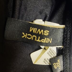 NipTuck one-piece, black and white striped swimsuit. It is a US size 8. It has ruching that gives a nice slimming effect. The straps are adjustable. It says the built-in bra has multi fit cups. Retails for $99