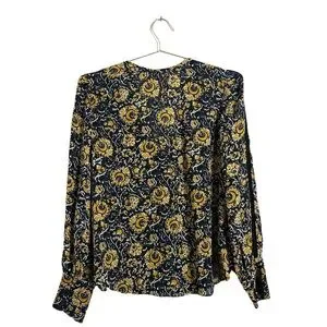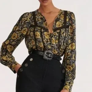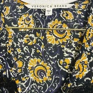 Veronica Beard "Tarry" blouse with lace insets. V neckline; button front. Long sleeves; button cuffs. Relaxed fit. Silk. Polyester lining. Dry clean. Imported.