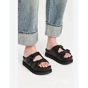 NEW UGG GOLDENSTAR HI SLIDE LEATHER BLACK PLATFORM SANDALS Sz 8