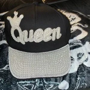 Elevate your style with this chic Queen cap. Featuring a bold black base and sparkling silver embellishments, it's perfect for adding a touch of glamour to any outfit. I just noticed on the crown ๐ on pearl is missing I can replace with rhinestone or give $5 off thanks ๐