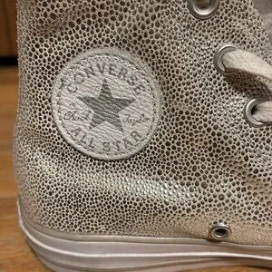 Stylish Converse high-top sneakers. Features a silver textured design. Iconic logo on the side.