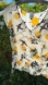 This delicate top features fluttered cap sleeves and dashes of gold against a cream background,