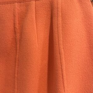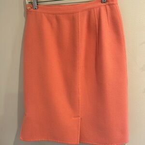 This knee-length pencil skirt by Salvatore Ferragamo is crafted in a vibrant orange hue, perfect for work or cocktail occasions. It features a sleek, tailored silhouette with pleated details and a side slit for added style and comfort. The skirt's structured design ensures a polished look, making it a versatile addition to any wardrobe. Fabric is wool. Zips on the side. Length measures 24 inches. Waist measures 29 inches. Hips measure 36 inches.