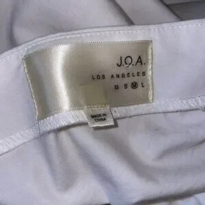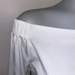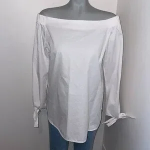 JOA Los Angeles long sleeve top tie detail at wrist cotton white medium. Crisp and clean white cotton off the shoulder top. Elevated basic. Ties at the sleeve. Gorgeous closet staple!