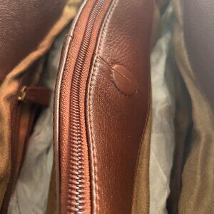 This new purse measures approximately 14 ½” x 10” with a handle drop of about 8”. The base of the purse measures about 14 1/2" x 4 1/2". There are no rips in the leather or interior lining. This purse has no stains anywhere on the interior or exterior of the purse. It also has its original packing material on the inside of the purse. Due to the fact that this is a new purse, all the zippers and snaps are in perfect working order. It is in pristine condition.