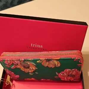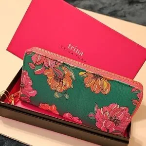 Discover the vibrant charm of the Trina Turk full zip around wallet, showcasing a striking green and pink floral design. This eye-catching accessory combines elegance with functionality, making it a perfect addition to your collection. Crafted with attention to detail, it offers a stylish way to carry your essentials.