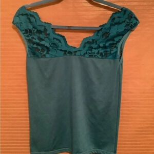 This is a little poly and lace pretty blue/ green blouse … both fabrics are very soft…it looks cute on…