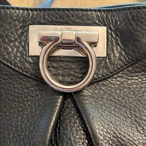 Salvatore Ferragamo Graziella black leather crossbody bag. This bag is in great condition. The black pebbled leather is in great shape except for every day creases. The bottom corners are scuffed, but still look great. The front hardware is bright with some scratches and wear. The strap is in good condition, some of the hardware has a few scratches here in there on the straps. Inside of bag in good condition with normal wear. Approximately 10 x 10.5 x 1.5.