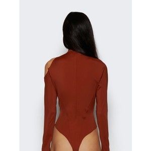 This captivating long-sleeved bodysuit is crafted from a premium fabric blend. The high neck and alluring swirling cut-out details create a striking appearance. Thumb holes and refined topstitching add to its contemporary silhouette, making it perfect for an empowered yet elegant look. This bodysuit transitions seamlessly from day to night.