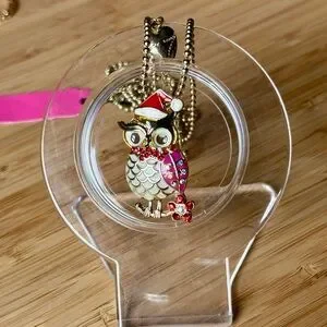 Make yourself festive with this charming owl pendant necklace! Featuring a playful mix of gold, pink, and red colors, this accessory adds a touch of whimsy to any outfit. Perfect for fashionistas!